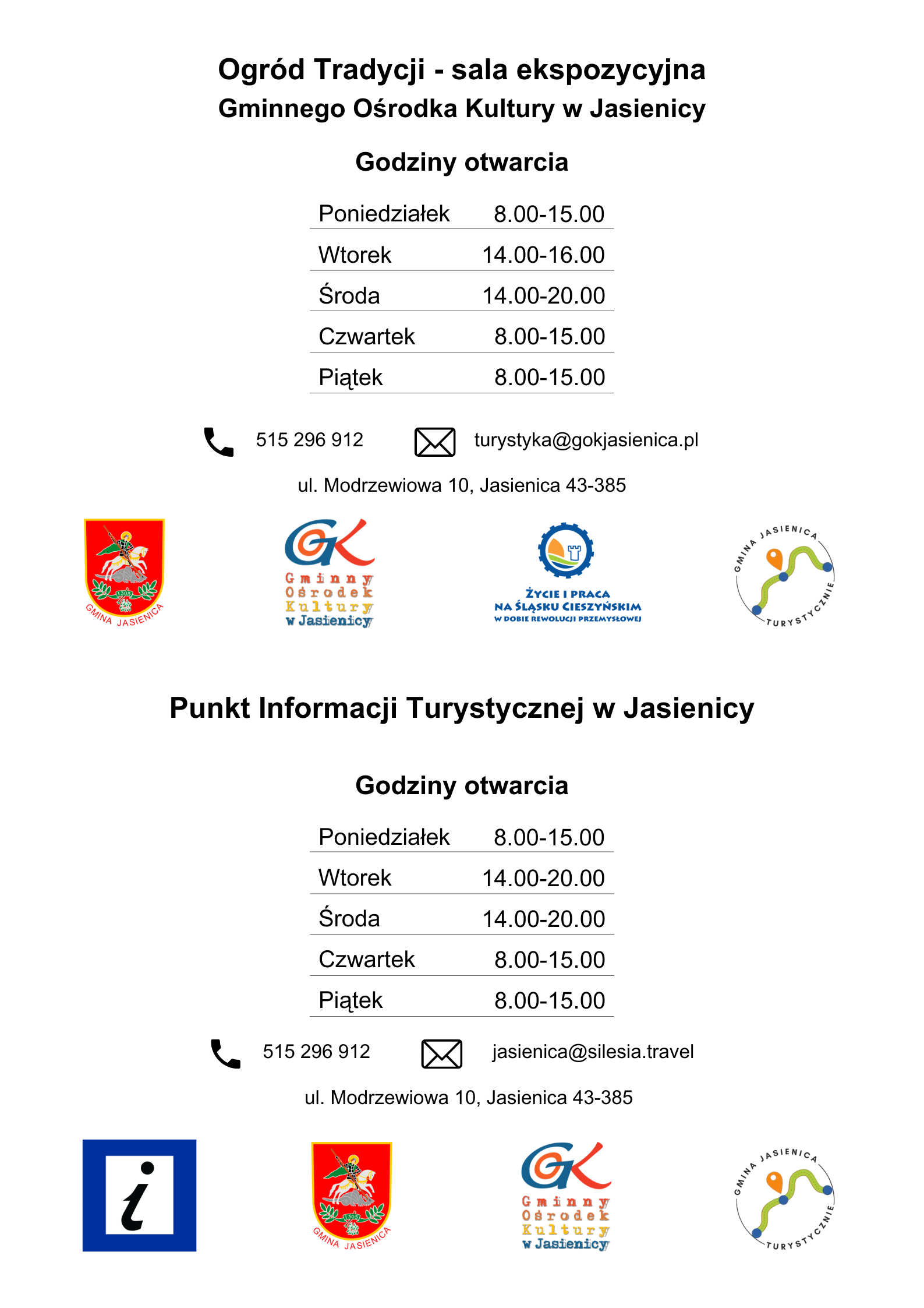 tel.: 515296912 e-mail: turystyka@gokjasienica.pladres: 43-385 Jasienica, ul. Modrzewiowa 10Godziny otwarcia: