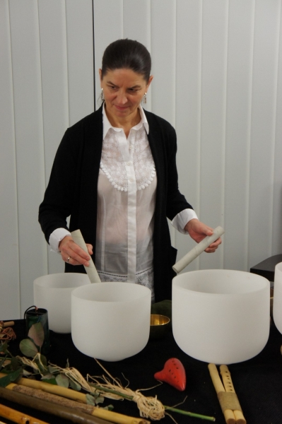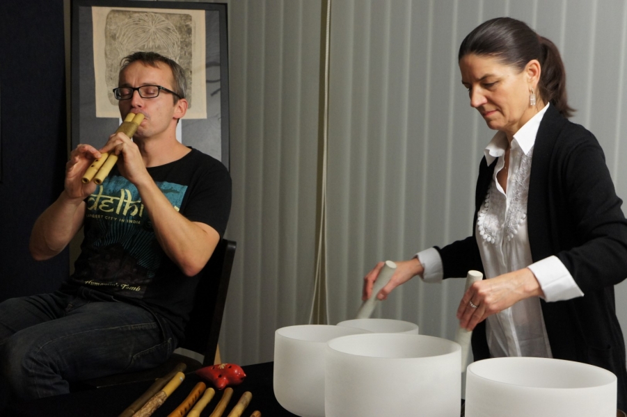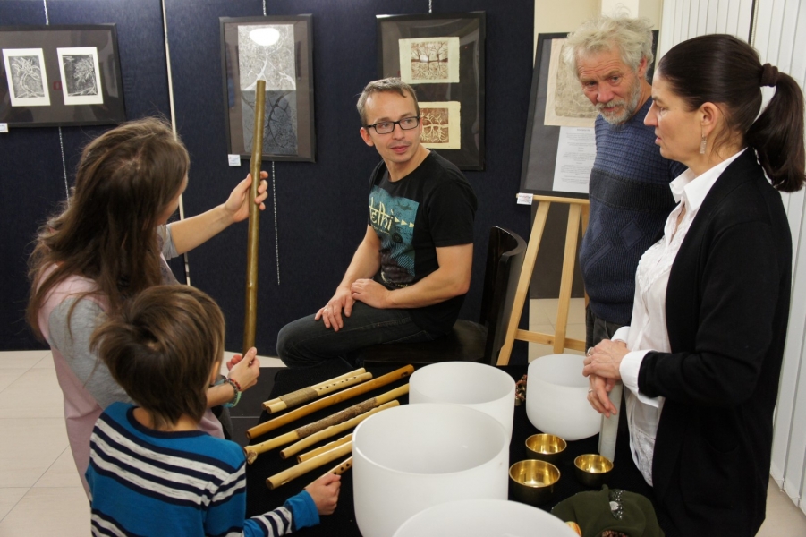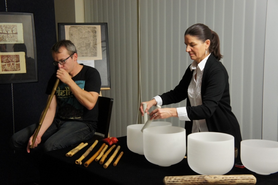 Dźwięki mis kryształowych i fletów pasterskich przywitały gości piątkowego wernisażu, który odbył się w 3 listopada w galerii Gminnego Ośrodka Kultury w Jasienicy. Wystawa zatytułowana "Od grafiki do idei" prezentuje grafiki i obrazy, których autorką jest Mariana Há/Horská. Magiczne tło dźwiękowe, które świetnie korespondowało z wystawionymi pracami stworzył duet artystów: Alina Danielewicz i Paweł Fejkisz.