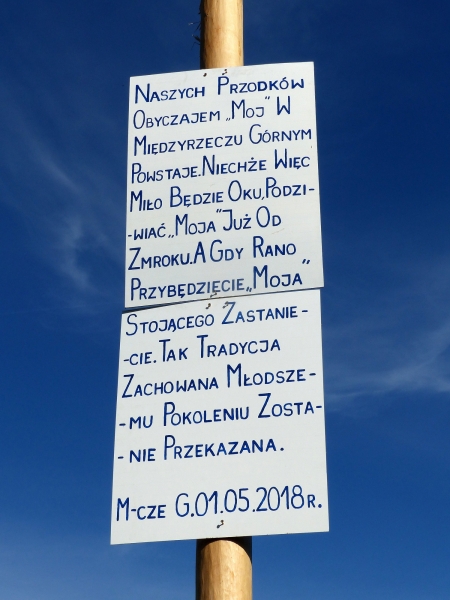 Tradycji stało się zadość. W nocy z 30 kwietnia na 1 maja w gminie Jasienica, pojawiły się piękne moje. Do konkursu "Najpiękniejszy moj" organizowanego przez GOK w Jasienicy zgłosiły się trzy sołectwa. Komisja oceniająca postanowiła jednogłośnie przyznać: I miejsce dla moja postawionego w Łazach II miejsce ex aequo dla moja postawionego w Międzyrzeczu Dolnym II miejsce ex aequo dla moja postawionego w Międzyrzeczu Górnym Organizatorzy konkursu serdecznie dziękują za zaangażowanie i udział w konkursie wszystkim uczestnikom. Dziękują również wszystkim, którzy służyli pomocą i radą, przekazując tym samym tradycje i dziedzictwo kulturowe Śląska Cieszyńskiego.