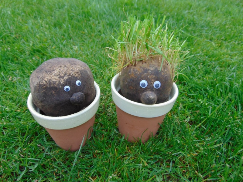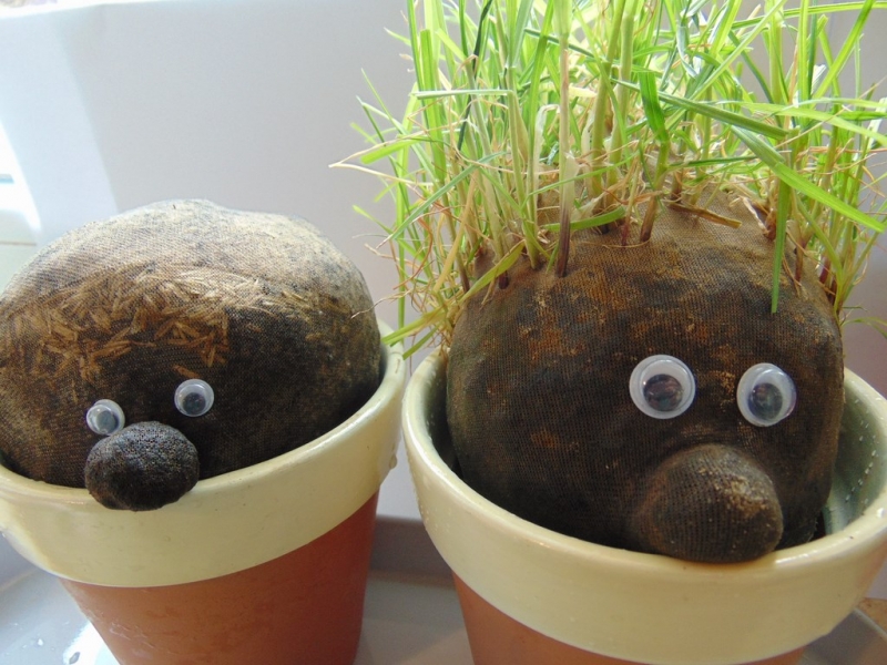 - krok czwarty: wymodelowaną głowę wkładamy do doniczki, podlewamy codziennie, cierpliwie czekamy….