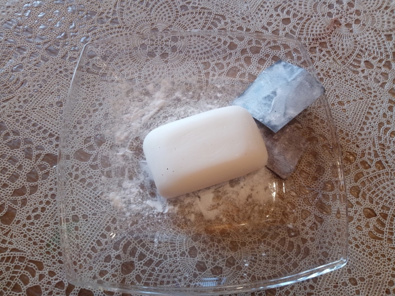 1. Zaczniemy od wypolerowania mydełka papierem ściernym (zazwyczaj z jednej strony bywają napisy, które są nam niepotrzebne)