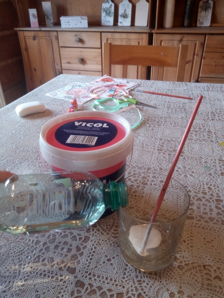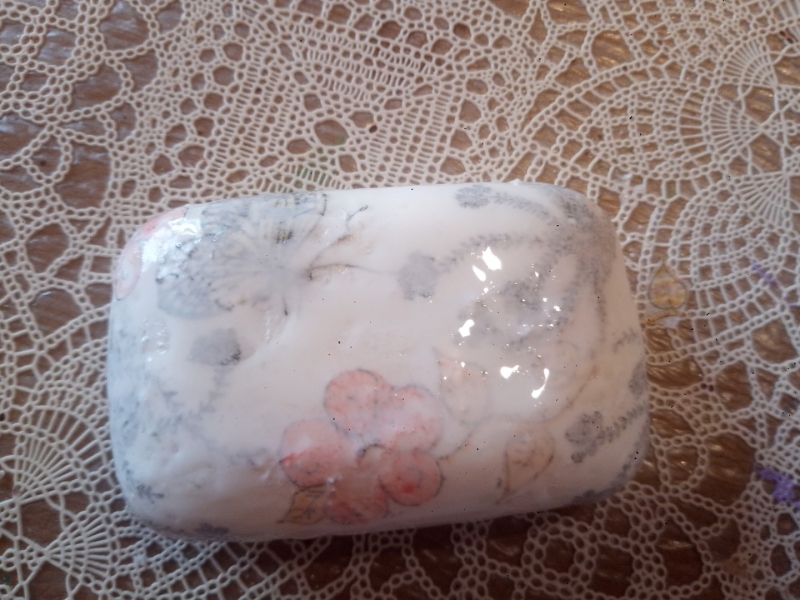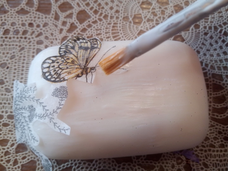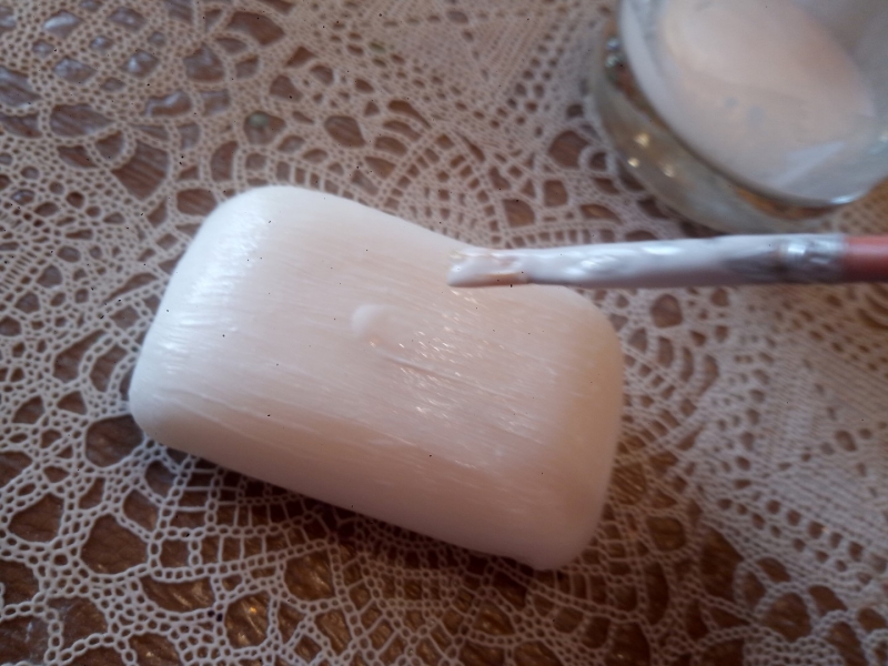 2.Aby nasz dekor na mydełku był trwały, lakierujemy mydełko rozcieńczonym klejem Vicol lub Magic (klej rozcieńczony wodą powinien mieć konsystencja gęstego mleka) i czekamy aż wyschnie.