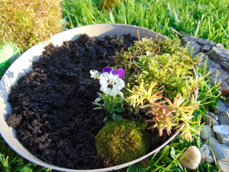 Krok pierwszy: wypełniamy nasza podstawkę ziemią, sadzimy rośliny, wypełniamy mchem
