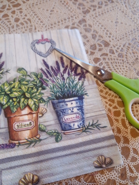 5. W tym czasie wybieramy ozdobny motyw z papierowej serwetki, staranie wycinamy i ostrożnie rozwarstwiamy serwetkę. Zazwyczaj są trzy warstwy – do dalszej pracy użyjemy tylko warstwę z motywem dekoracyjnym.