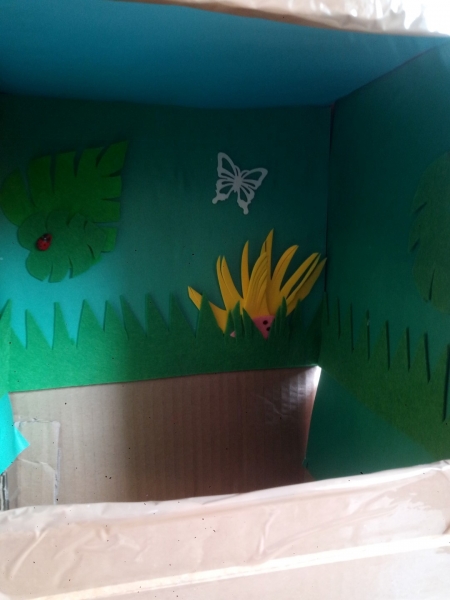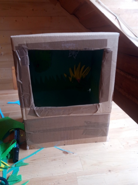 1. Na początku musimy przygotować jedną z najważniejszych części teatru czyli scenę. W tym celu w pudle wycinamy duży otwór, który będzie naszym „oknem” scenicznym. Nie zapomnijcie również z boku pudła wyciąć drugi otwór, który posłuży nam do animacji kukiełek.