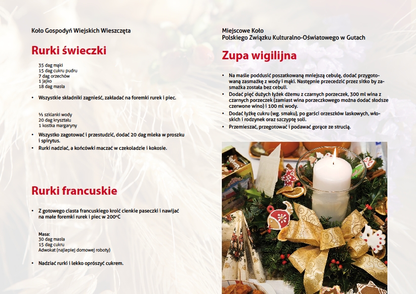 Jak już zapewne Państwo wiedzą, tegoroczne spotkanie z cyklu „Josiynicko Wilija” nie odbędzie się. Bardzo nam przykro z tego powodu :( Przypomnimy chociaż kilka smakowitych przepisów na potrawy świąteczne, które przygotowywały panie z naszych gminnych Kół Gospodyń Wiejskich. W recepturach można również znaleźć przepis na pyszną zupę wigilijną, którą ugotowało zaprzyjaźnione Miejscowe Koło PZKO w Gutach (Czechy). Wszystkie potrawy brały udział w przeglądzie kulinarnym „Stoły świąteczne na Śląsku Cieszyńskim”. Mamy nadzieję, że przepisy przypadną Państwu do gustu i któraś z tych potraw pojawi się na domowym, wigilijnym stole. Smacznego!