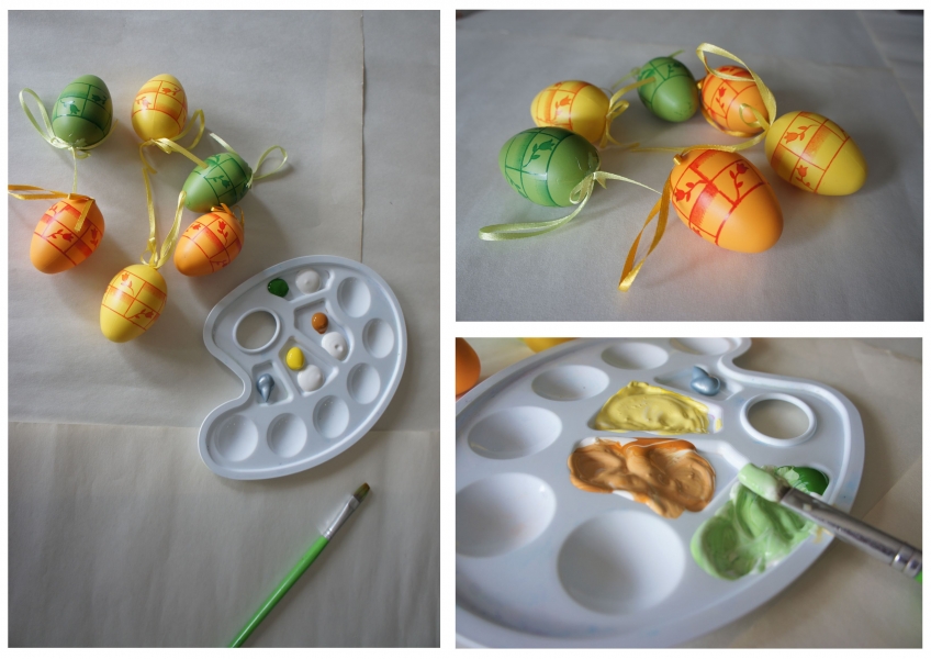 · W tym przypadku zaczęliśmy od przemalowania ozdobnych jajeczek, gdyż nie pasowały do koncepcji. Można do tego wykorzystać farby akrylowe, zwykłe plakatówki czy spray.