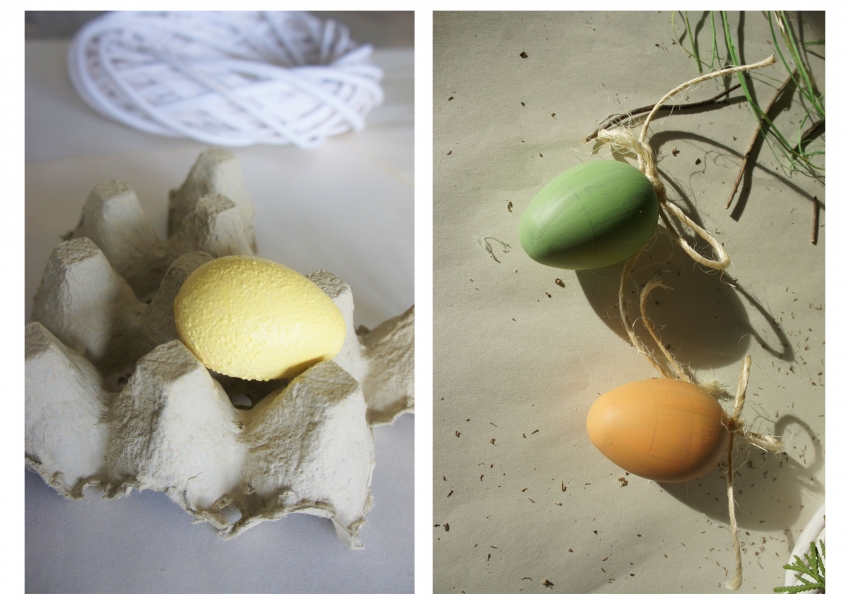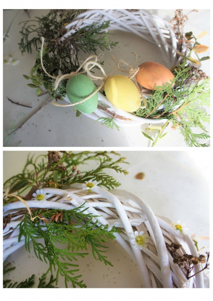 · Idąc zgodnie z koncepcją „więcej naturalnego niż sztucznego” kolorowe wstążeczki w przemalowanych jajkach zostały zamienione na jutowe kokardki.