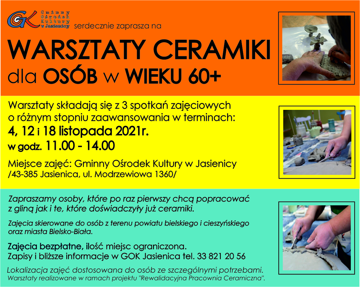 Zapraszamy osoby w wieku 60+ na bezpłatne warsztaty ceramiki. Warsztaty składają się z 3 spotkań zajęciowych 4, 12 i 18 listopada 2021 r. w godz. 11.00 – 14.00.