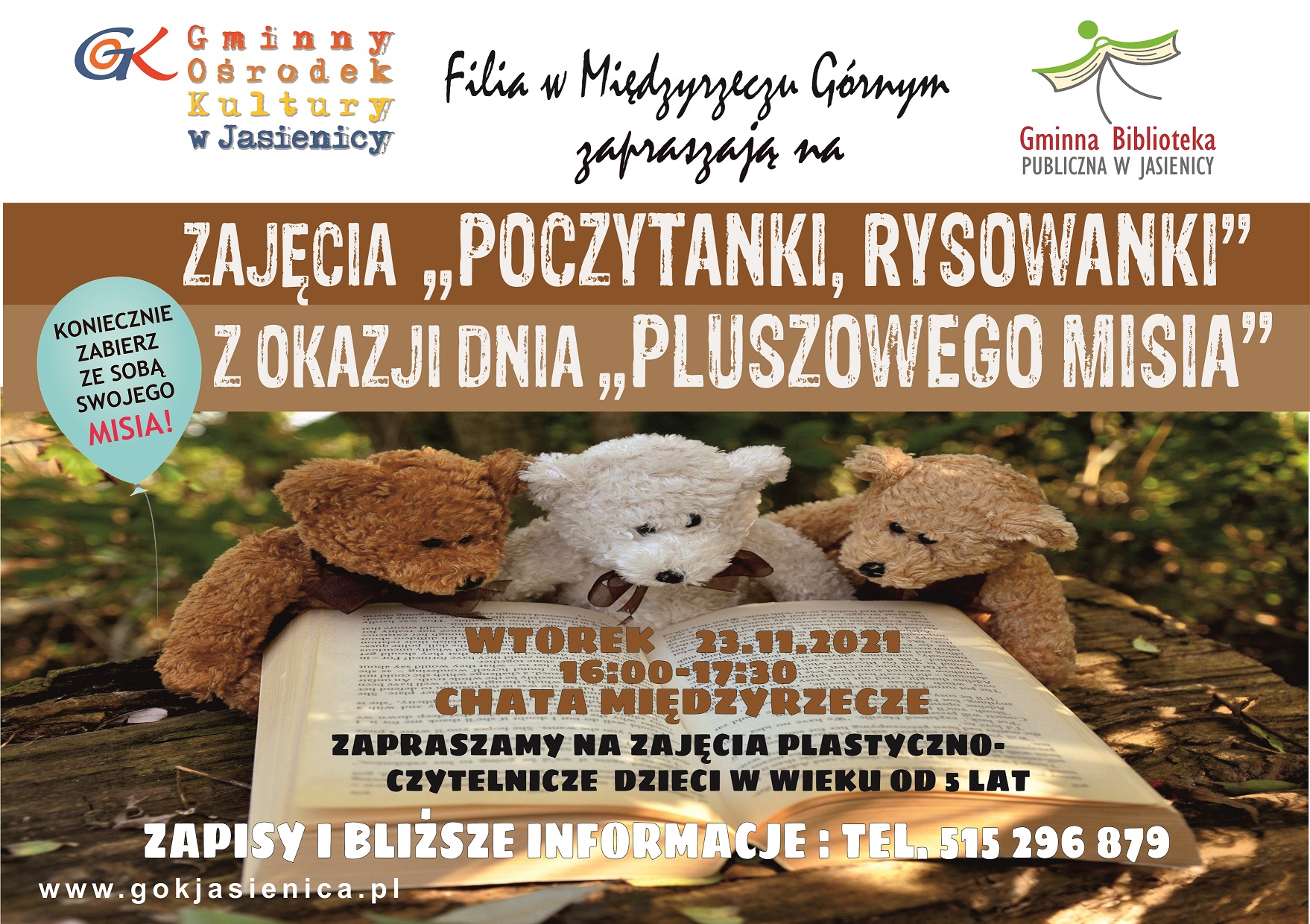 Filia GOK w Międzyrzeczu Górnym wraz z Gminną Biblioteką Publiczną w Jasienicy zapraszają na zajęcia plastyczno-czytelnicze "Poczytanki, Rysowanki". Tematem listopadowego spotkania będzie „Dzień pluszowego misia” (Międzynarodowy Dzień Pluszowego Misia obchodzony jest 25 listopada -od 2002 roku, w którym to przypadła setna rocznica powstania maskotki).