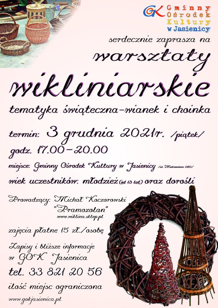 Zapraszamy do Gminnego Ośrodka Kultury w Jasienicy (ul. Modrzewiowa 1360) na świąteczne warsztaty wikliniarskie. Podczas spotkania wykonamy wiklinowy wianek i choinkę.