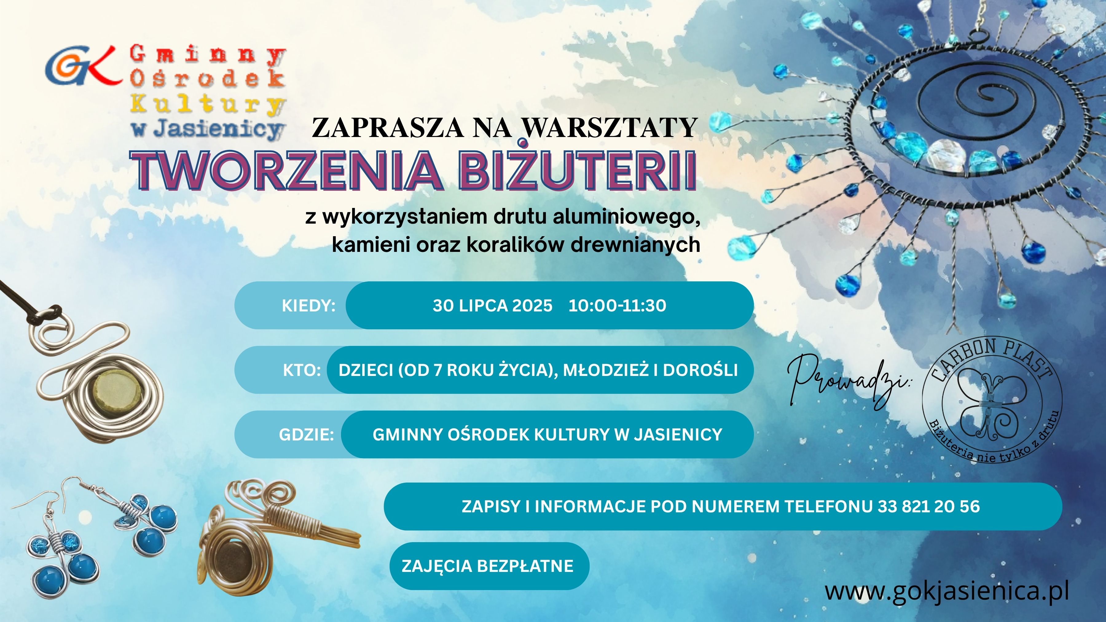 Zapraszamy dzieci (od 7 roku życia), młodzież i dorosłych na bezpłatne warsztaty „Tworzenie biżuterii”. W trakcie zajęć wykorzystamy m.in. drut aluminiowy, kamienie, koraliki drewniane.