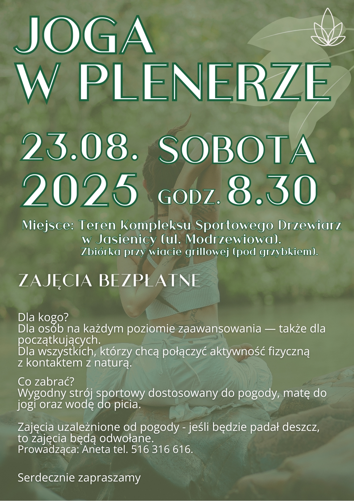 - Wygodny strój sportowy dostosowany do pogody, matę do jogi, wodę do picia.