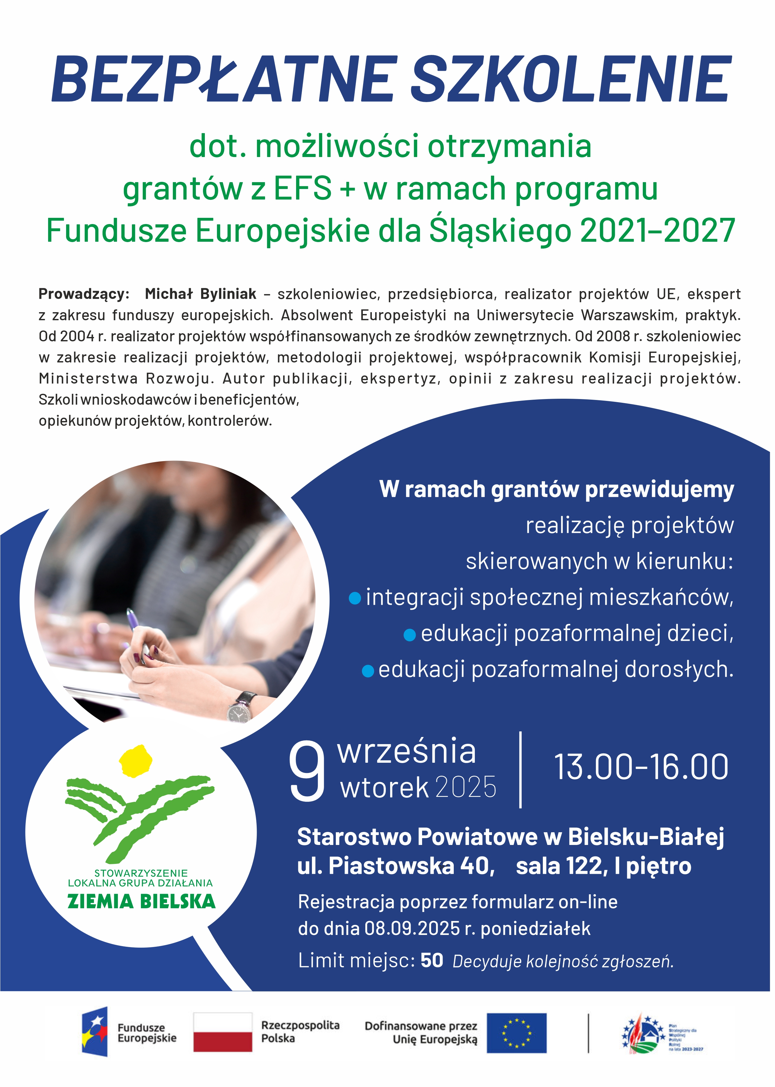 Stowarzyszenie LGD Ziemia Bielska informuje o bezpłatnym szkoleniu dotyczącym aplikowania o granty i ich rozliczanie ze środków LGD Ziemia Bielska w ramach Europejskiego Funduszu Społecznego PLUS (EFS +) dla przedstawicieli Urzędów Gmin, Gminnych Ośrodków Kultury, Organizacji Pozarządowych (NGO). Szkolenie odbędzie się we wtorek 9 września w godzinach od 13:00-16:00.