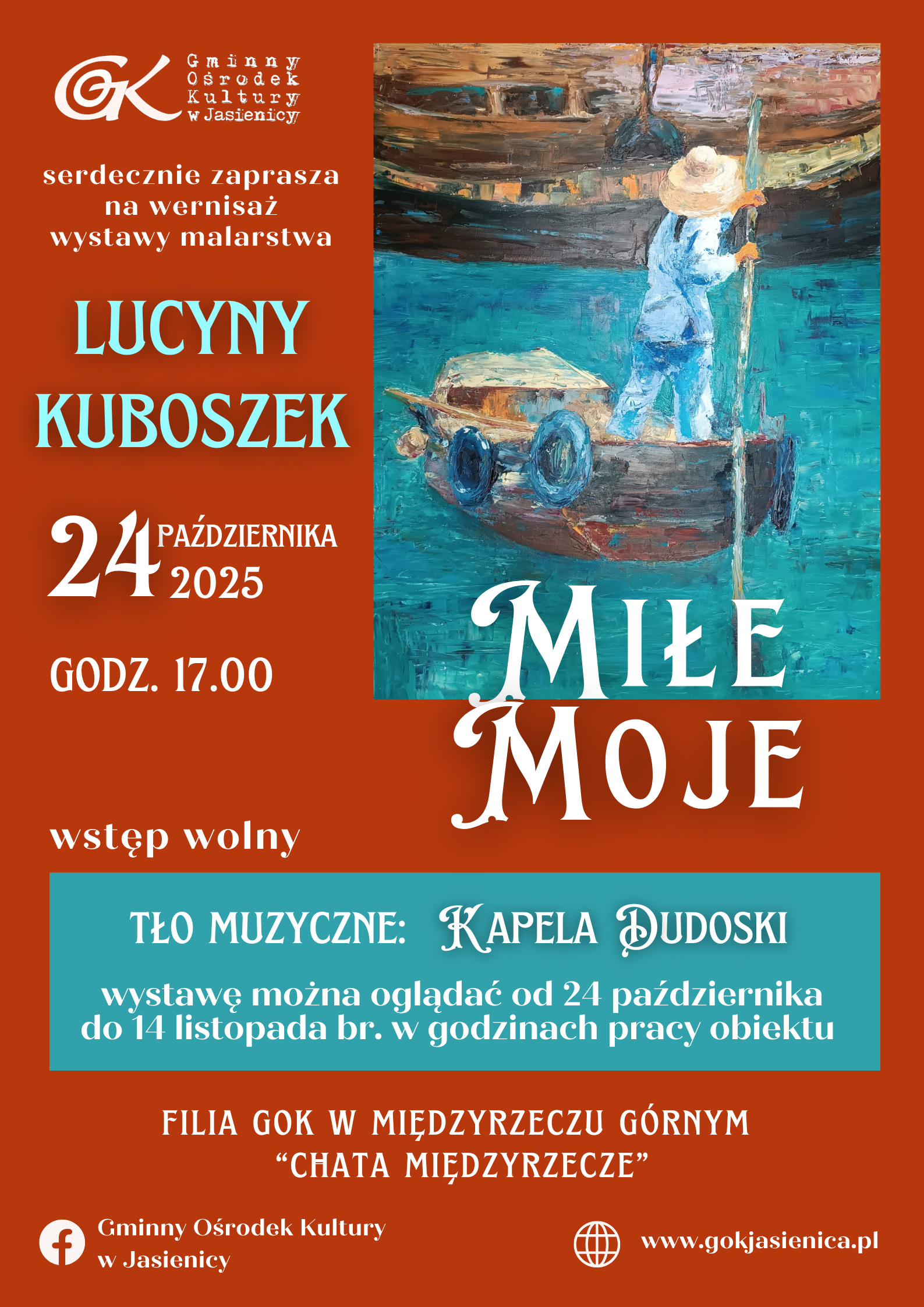 Filia GOK w Międzyrzeczu Górnym „Chata Międzyrzecze” zaprasza 24 października 2025 r. (piątek) o godz. 17.00 na wernisaż wystawy malarstwa Lucyny Kuboszek pt. „MIŁE MOJE”.