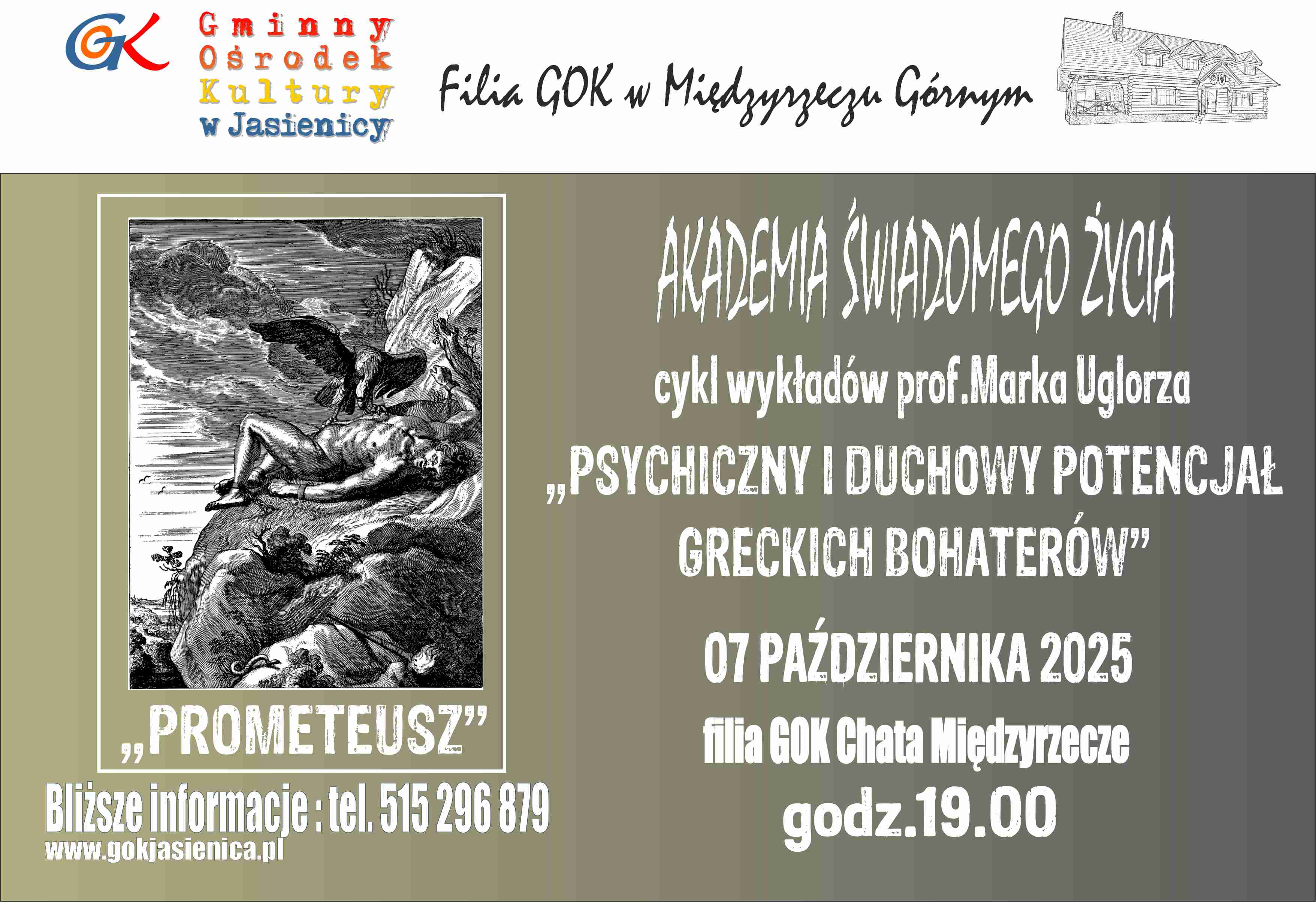Na kolejne spotkanie z cyklu: Psychiczny i duchowy potencjał greckich bohaterów pt. "Prometeusz", zapraszamy 7 października (wtorek) 2025 r., o godz. 19.00 do Chaty Międzyrzecze.