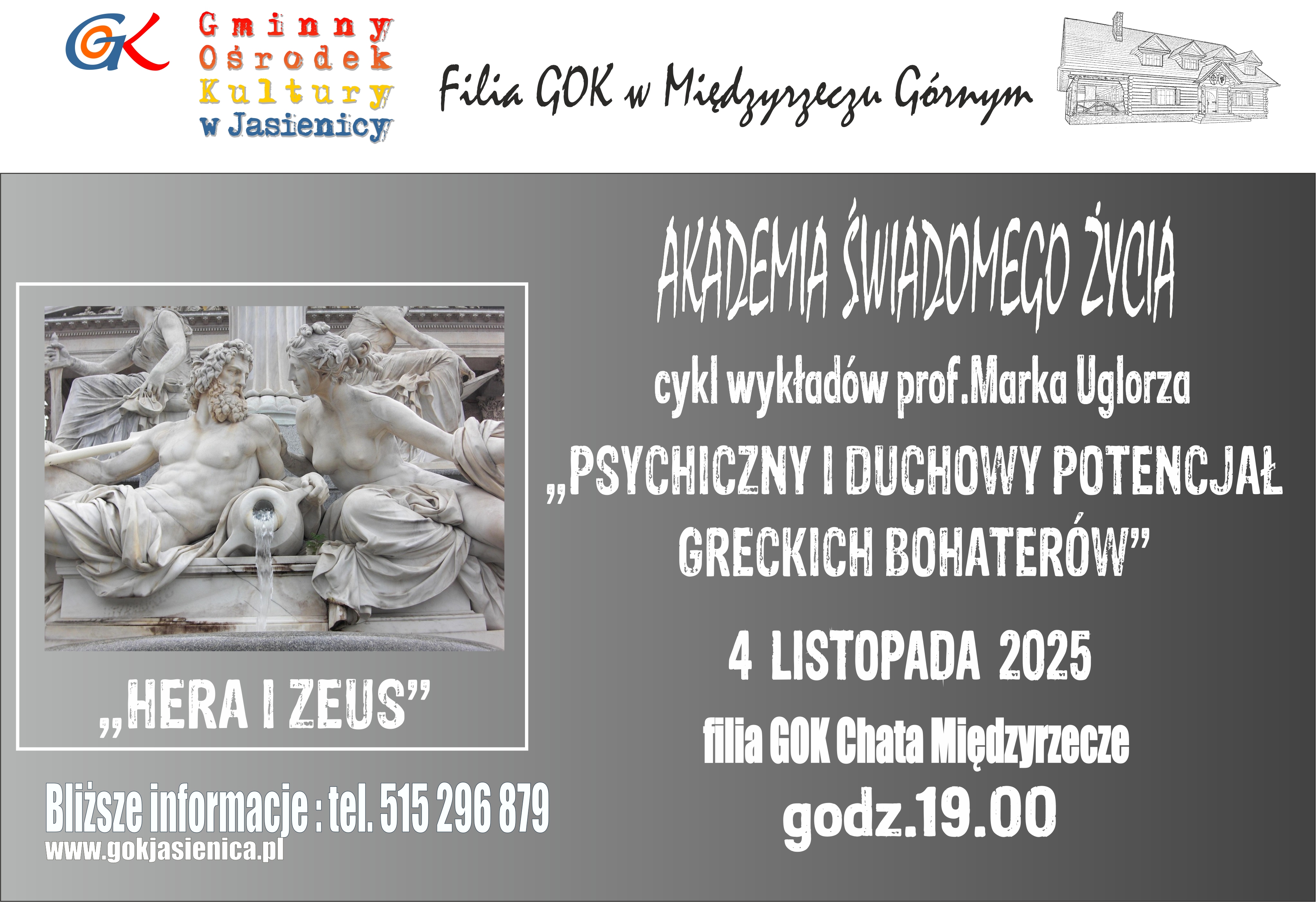 Na kolejne spotkanie z cyklu: Psychiczny i duchowy potencjał greckich bohaterów pt. "Hera i Zeus", zapraszamy 4 listopada (wtorek) 2025 r., o godz. 19.00 do Chaty Międzyrzecze.