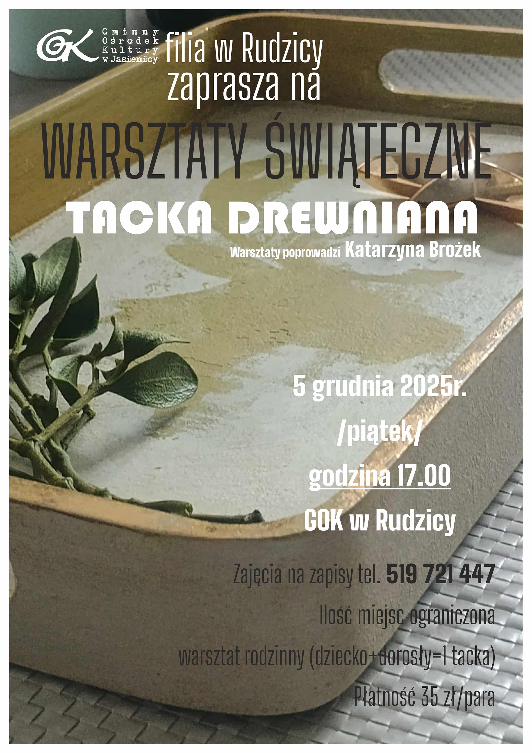 Warsztaty odbędą się 5 grudnia 2025 r. /piątek/ o godz. 17.00 – warsztat rodzinny (dziecko + dorosły), płatność 35 zł/para. Zajęcia poprowadzi Katarzyna Brożek.