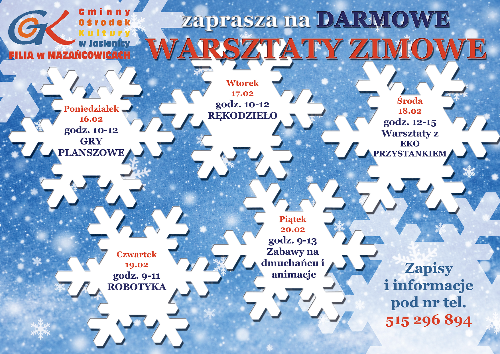 Filia GOK w Mazańcowicach zaprasza dzieci i młodzież na "Warsztaty zimowe".
