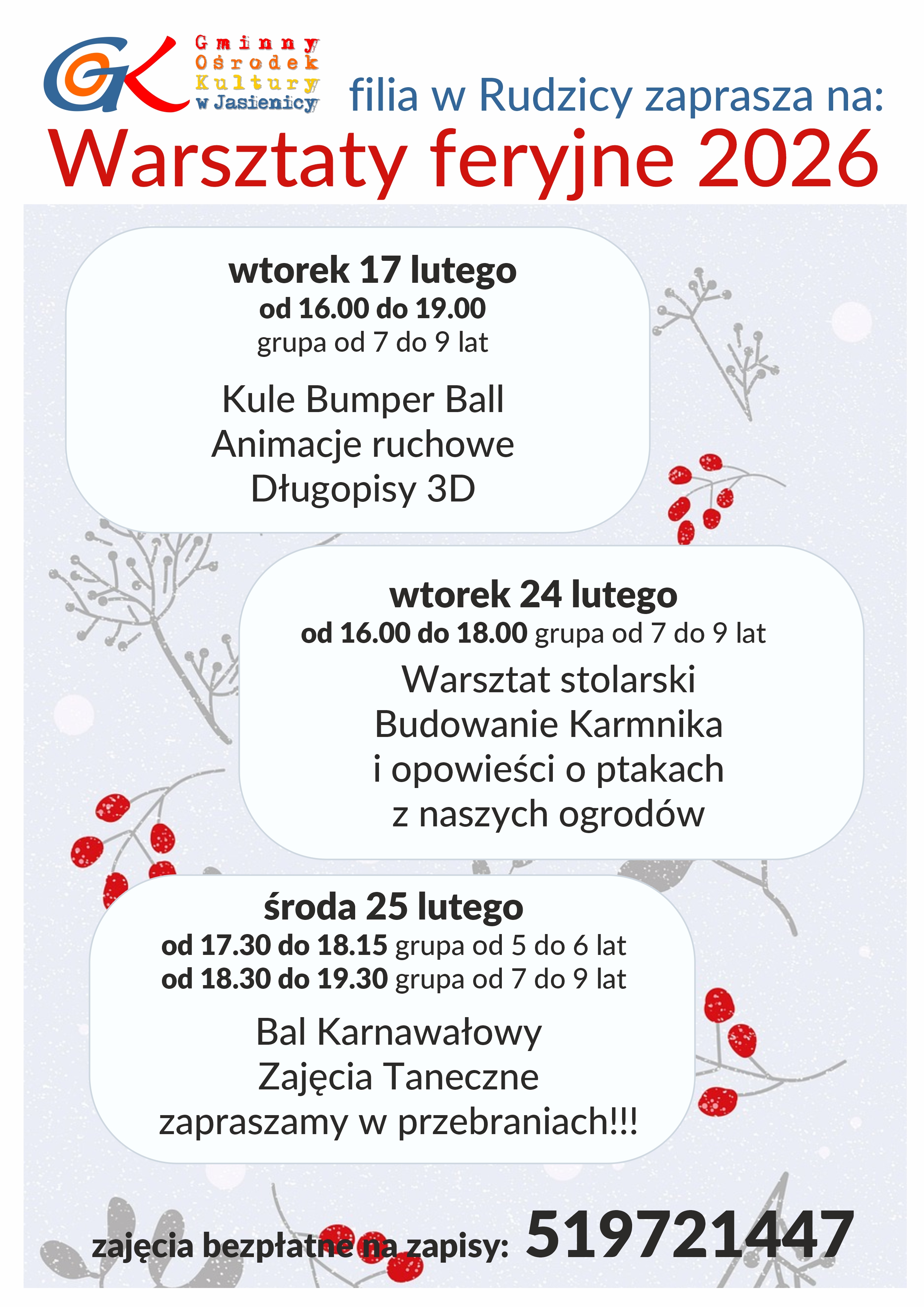 Filia GOK w Rudzicy zaprasza dzieci na „Warsztaty feryjne 2026”.