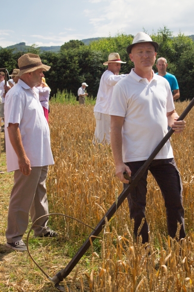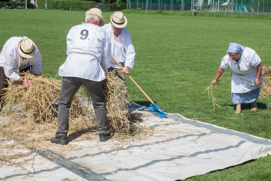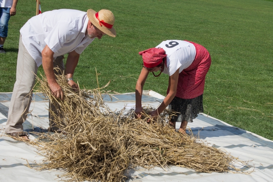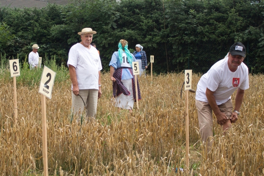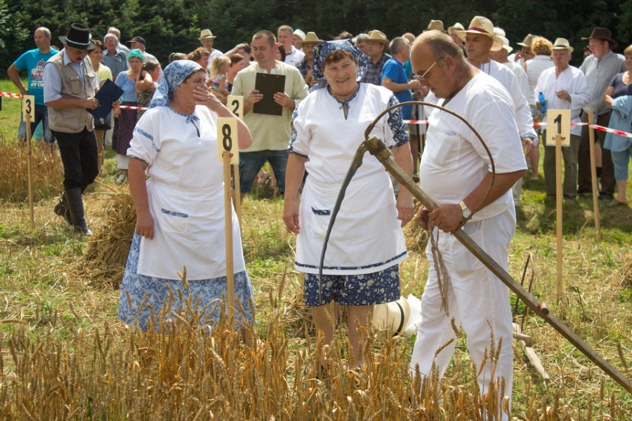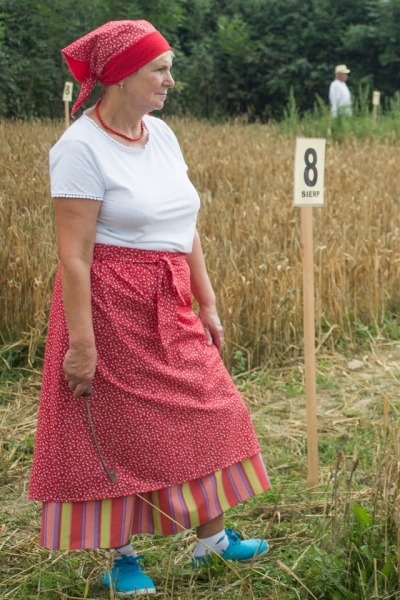 Trzyosobowa drużyna na wcześniej wylosowanym poletku: 1 osoba kosiła zboże, 2 osoby zbierały zboże, wiązały je w snopki i ustawiły kopki. Ocenie podlegał czas i jakość.
