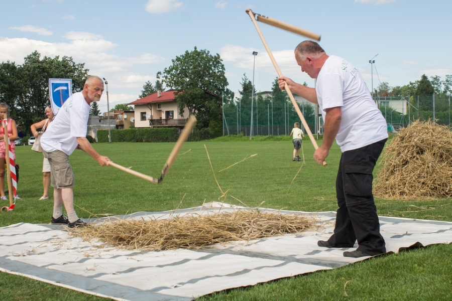 Drużyna dwuosobowa młóciła wylosowane snopki – 6 szt na drużynę. Konkurencja trwała 2 minuty. Po upływie czasu zawodnicy zebrali wymłócone zboże i przesiali je przez sito, następnie zboże zważono. Ocenie podlegała waga wymłóconego zboża.
