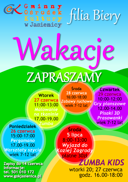 Zapraszamy do filii GOK w Bierach na zajęcia wakacyjne.