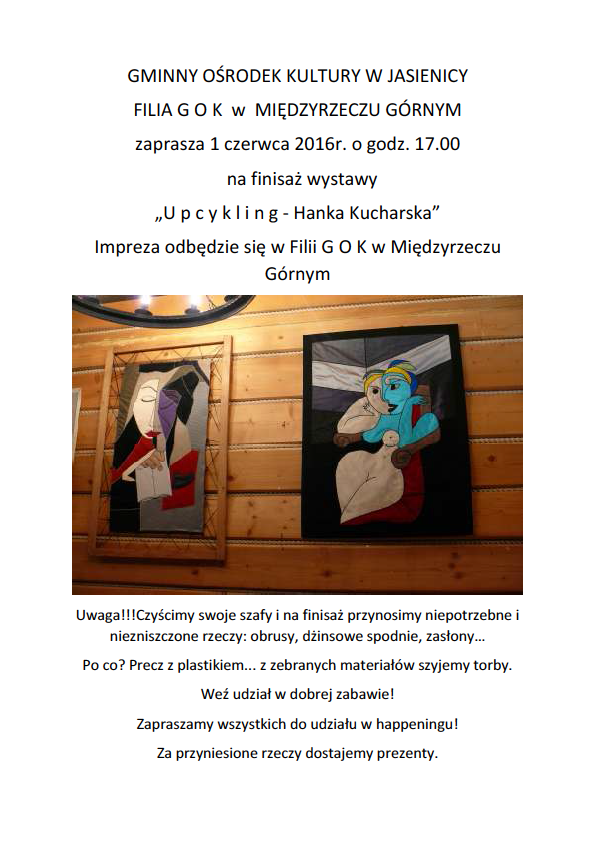 1 czerwca 2016r. w filii GOK w Międzyrzeczu Górnym o godz. 17.00 rozpocznie się finisaż wystawy "Upcykling - Hanka Kucharska".