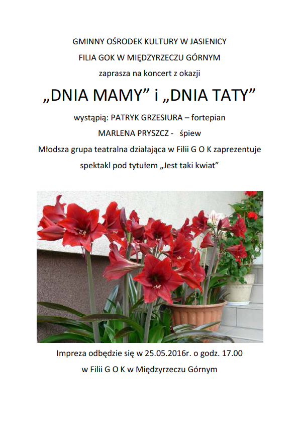 25 maja zapraszamy do filii GOK w Międzyrzeczu Górnym na koncert z okazji "Dnia Mamy" i "Dnia Taty".
