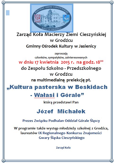 Zapraszamy do Grodźca na prelekcję pt. "Kultura pasterska w Beskidach - Wałasi i Górale".