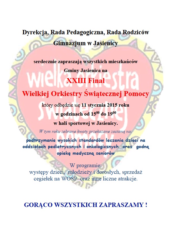 W imieniu organizatorów zapraszamy na XXIII Finał Wielkiej Orkiestry Świątecznej Pomocy.