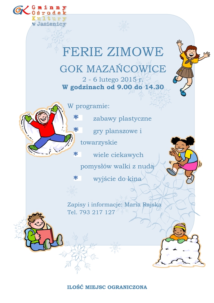 Zapraszamy na ferie zimowe do filii GOK w Mazańcowicach.