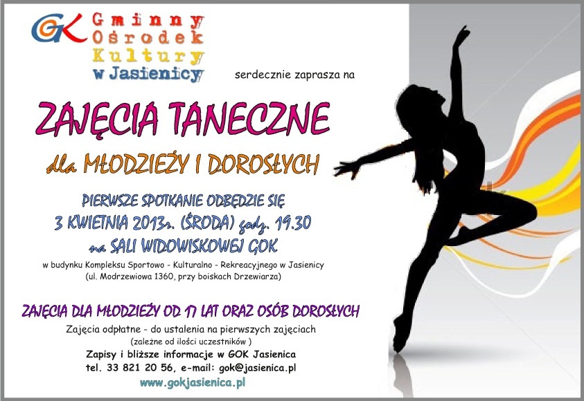 Zapraszamy młodzież i dorosłych do GOK Jasienica na zajęcia taneczne.
