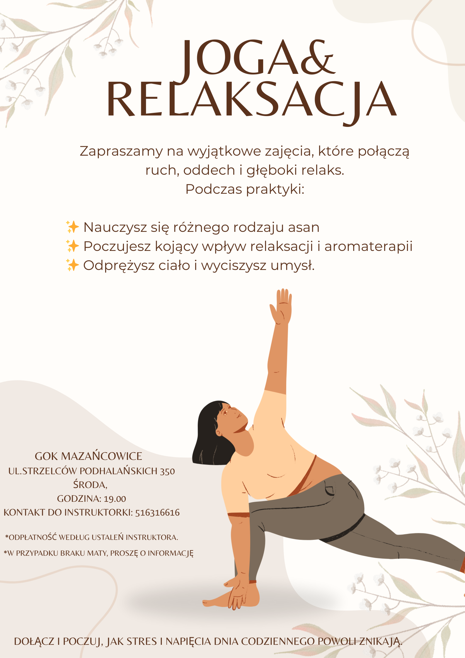 Ćwiczenia asan, a po praktyce głęboki relaks przy kojących dźwiękach i zapachu olejków unoszących się w powietrzu. Dołącz i poczuj, jak znikają napięcia dnia codziennego. Praktykę poprowadzi instruktorka, która ukończyła kurs nauczycielski w Indiach.