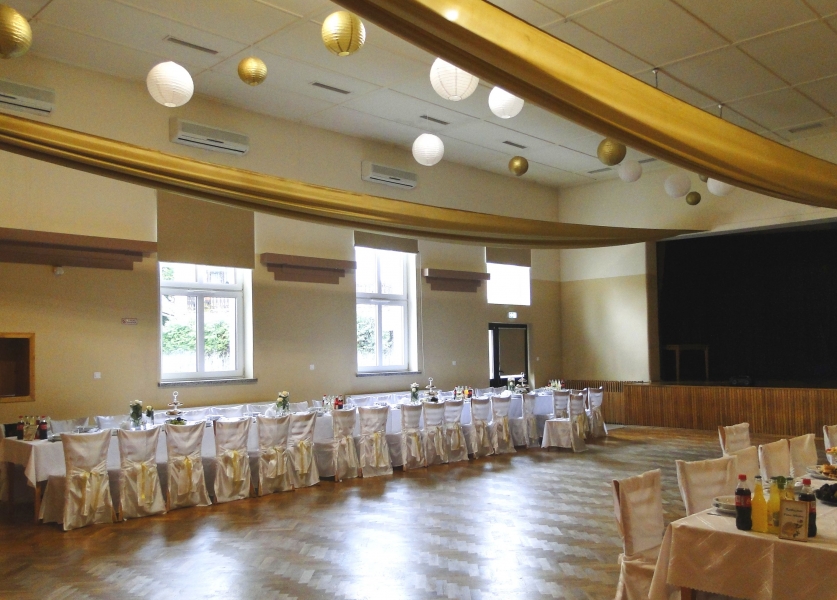 Oferujemy Państwu wynajen sali widowiskowej ( wraz z zapleczem ) na wesela, uroczystości rodzinne i inne imprezy okolicznościowe.