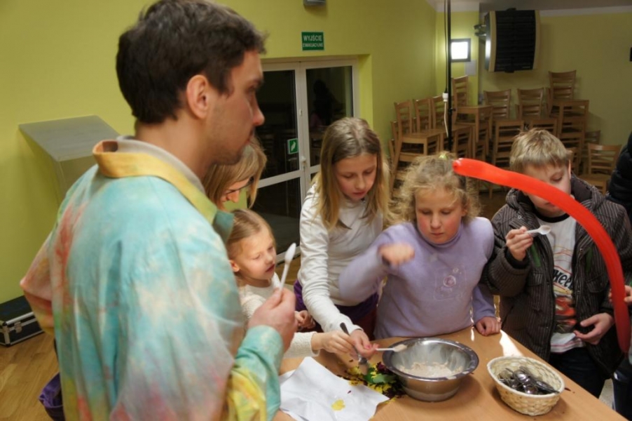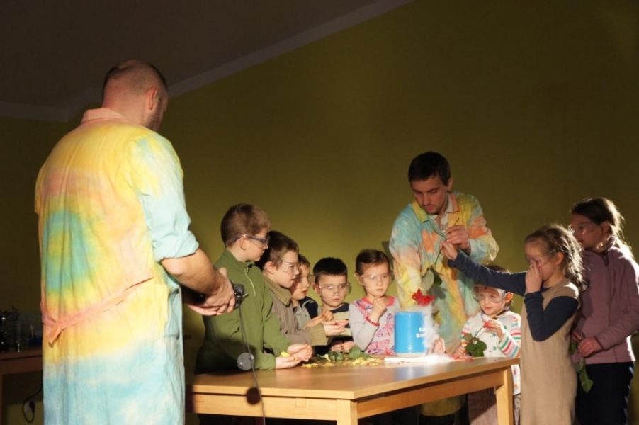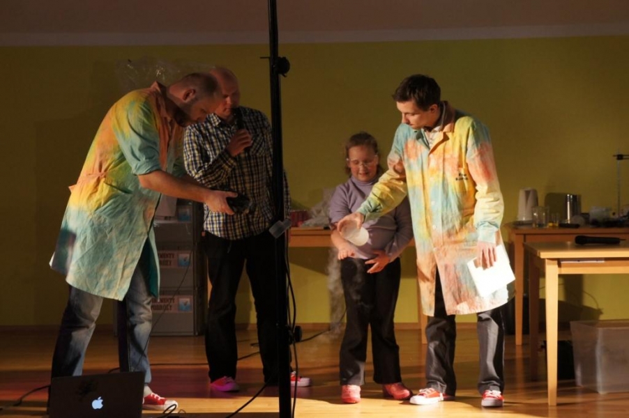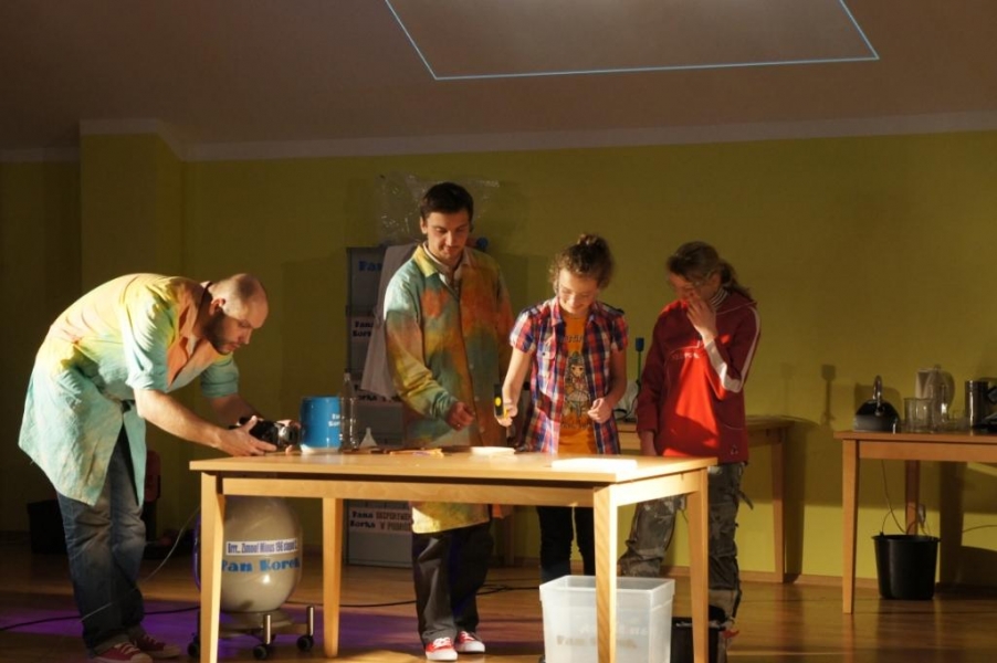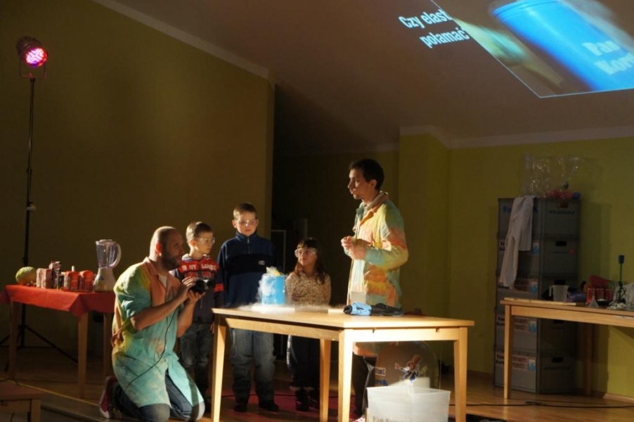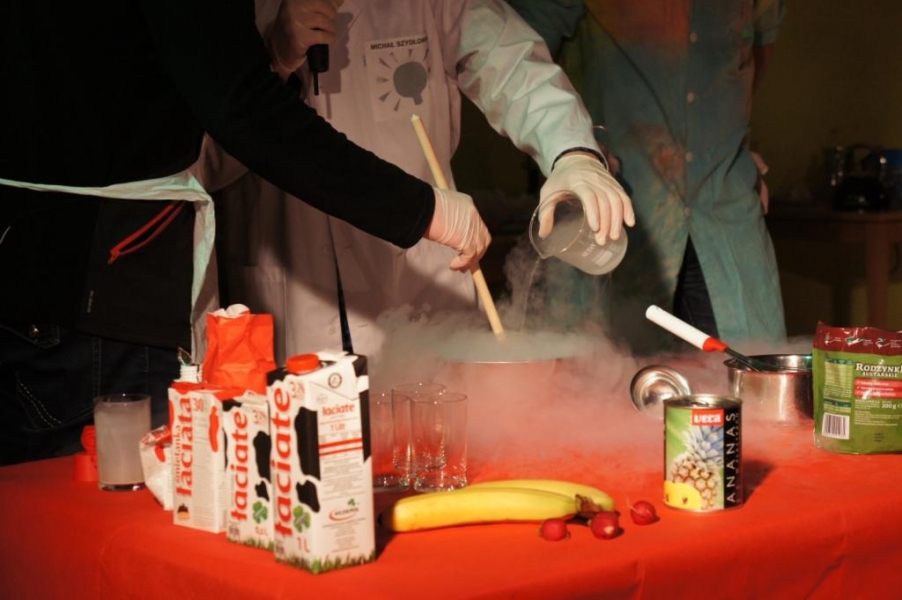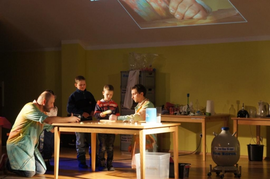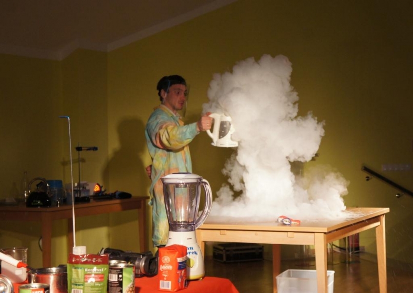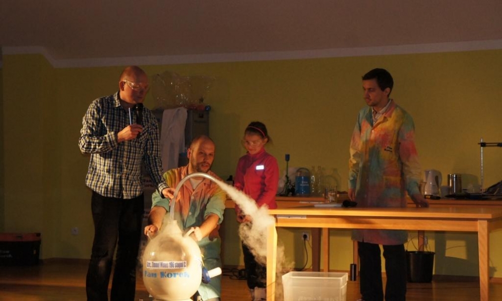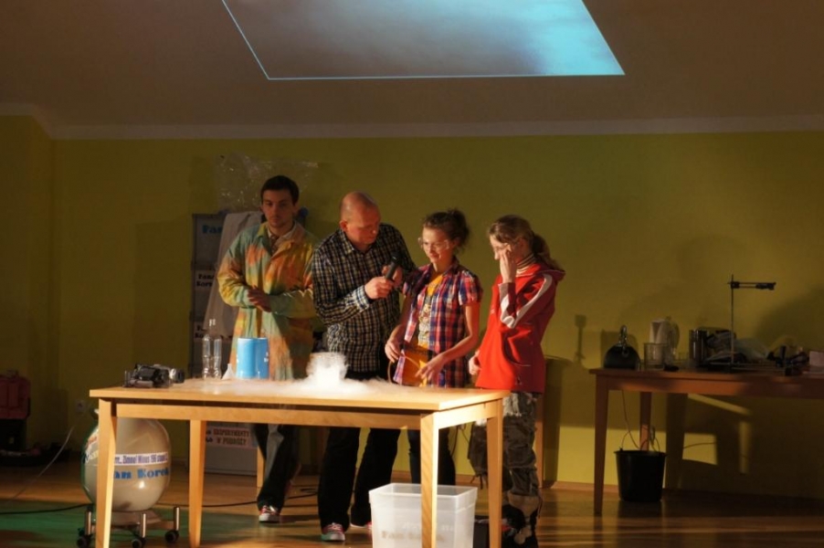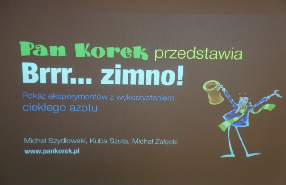 "Brrr zimno... czyli ciekły azot" - pod takim tytułem przebiegły niezwykle widowiskowe warsztaty, przeprowadzone przez ekipę Pana Korka. Uczestnicy spotkania mogli się przekonać jak niska temperatura (minus 196°C) zmienia właściwości różnych materiałów i przedmiotów. W zaimprowizowanym laboratorium młodzi naukowcy wykonali także doświadczenia dotyczące związku temperatury, ciśnienia i objętości dla gazów. Bananowy młotek i szklane róże, azotowa armata, oddychające balony czy zamrożony czajnik - to niektóre z licznych eksperymentów przeprowadzonych podczas warsztatów. Spotkanie zakończyło wielkie ale bezpieczne BUM oraz degustacja ... azotowych lodów.