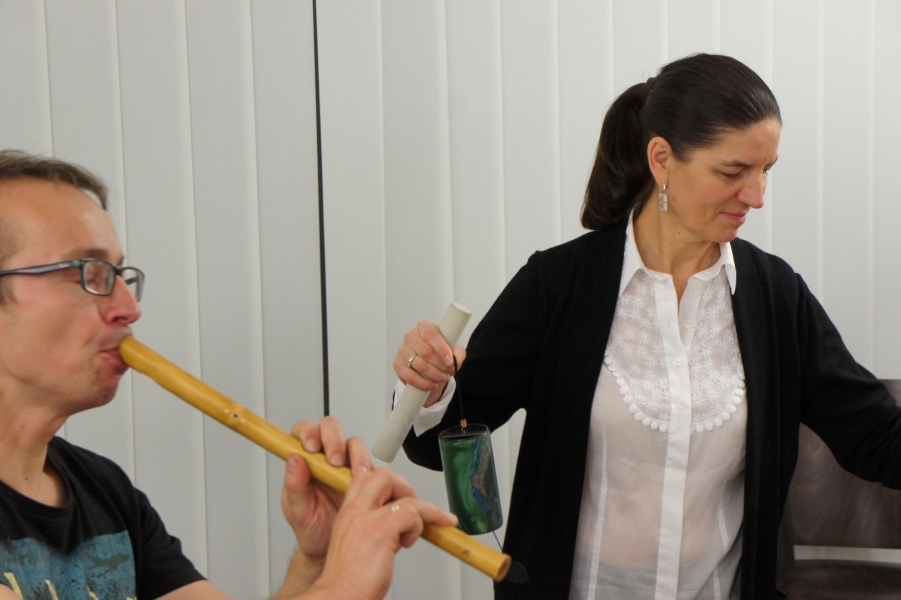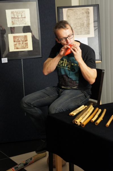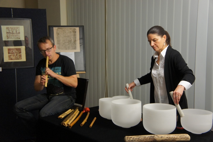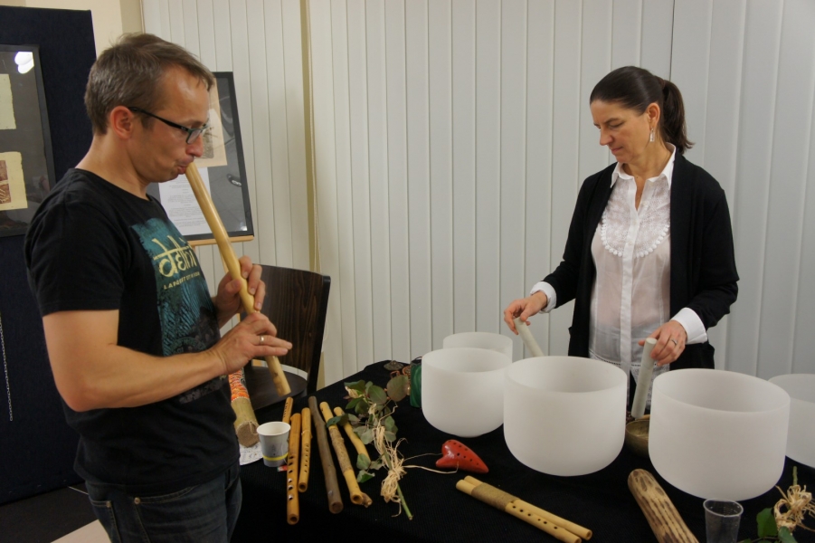 Dźwięki mis kryształowych i fletów pasterskich przywitały gości piątkowego wernisażu, który odbył się w 3 listopada w galerii Gminnego Ośrodka Kultury w Jasienicy. Wystawa zatytułowana "Od grafiki do idei" prezentuje grafiki i obrazy, których autorką jest Mariana Há/Horská. Magiczne tło dźwiękowe, które świetnie korespondowało z wystawionymi pracami stworzył duet artystów: Alina Danielewicz i Paweł Fejkisz.