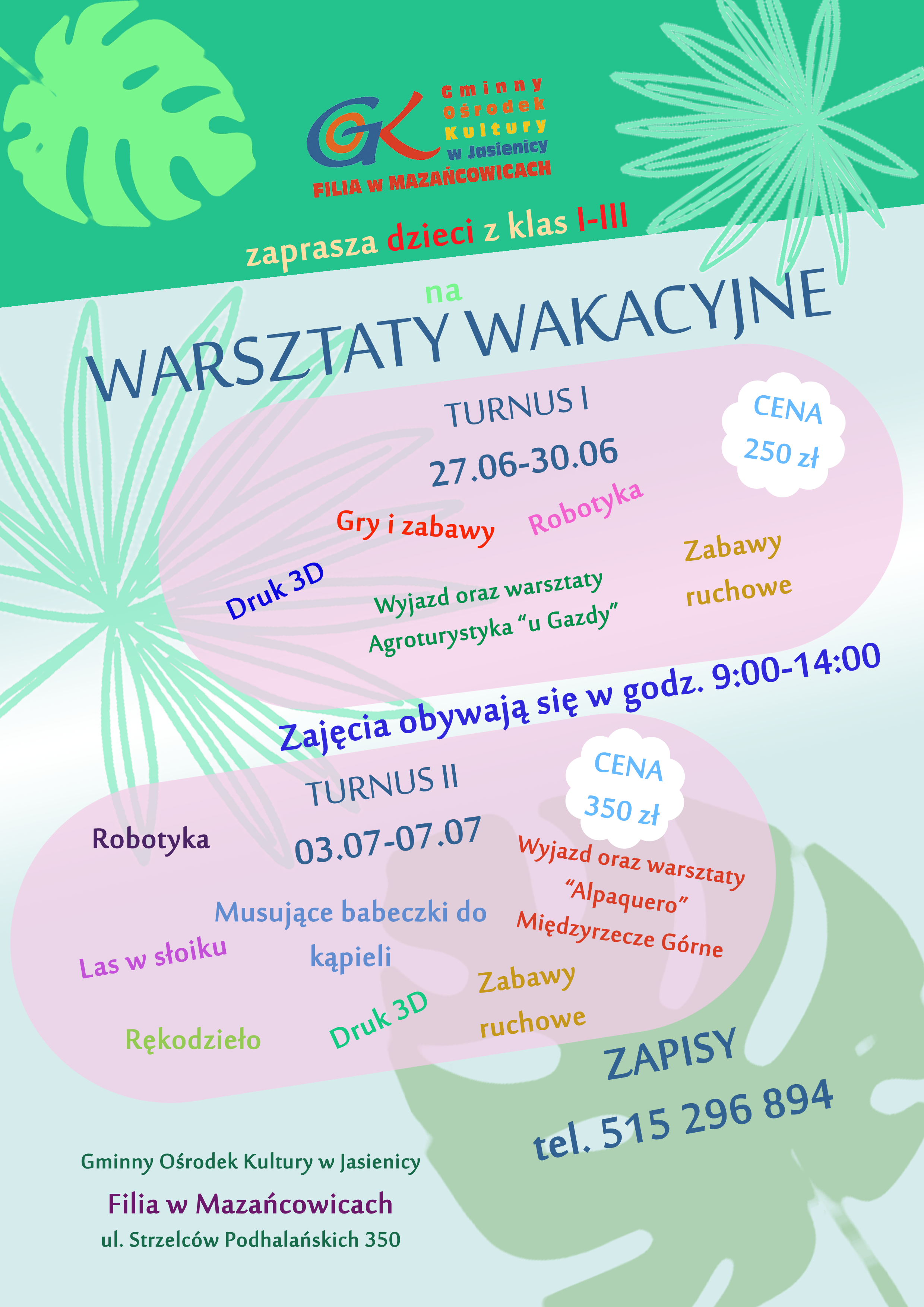Szczegółowe informacje i zapisy pod nr tel. 515 296 894