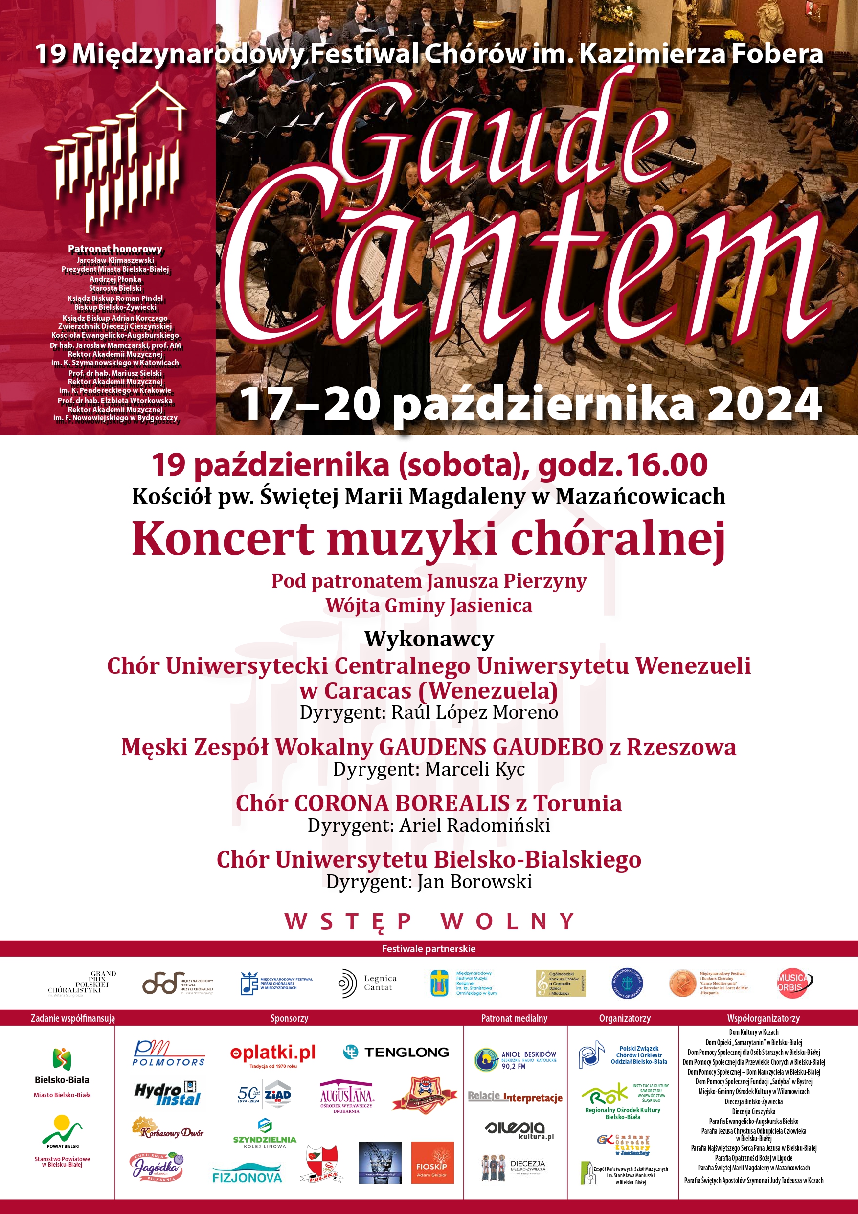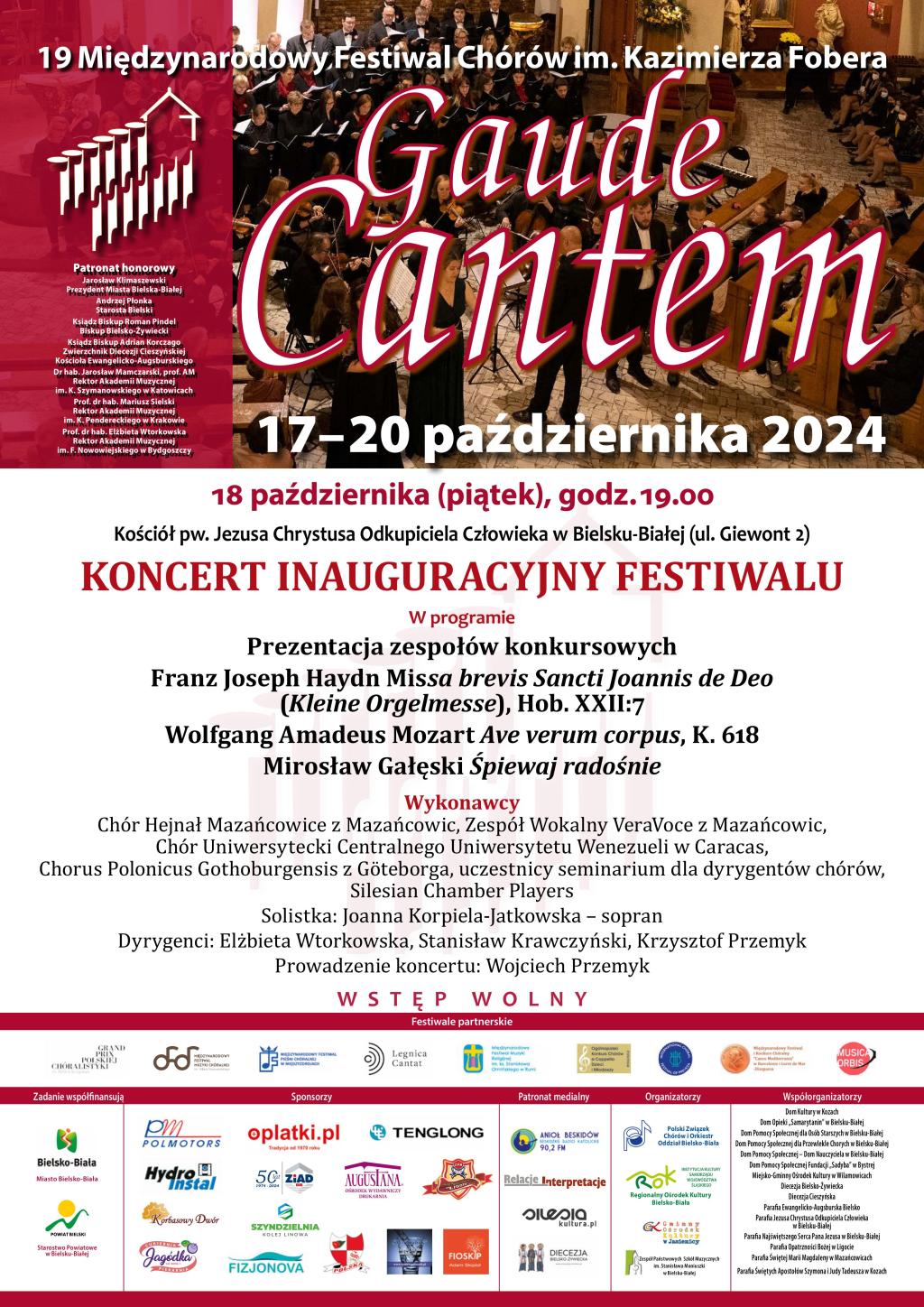 Koncert inauguracyjny Festiwalu (z udziałem Chóru Hejnał Mazańcowice) odbędzie się 18 października (piątek) 2024 r. o godz. 19.00 w kościele pw. Jezusa Chrystusa Odkupiciela Człowieka w Bielsku-Białej (ul. Giewont 2). Wstęp wolny
