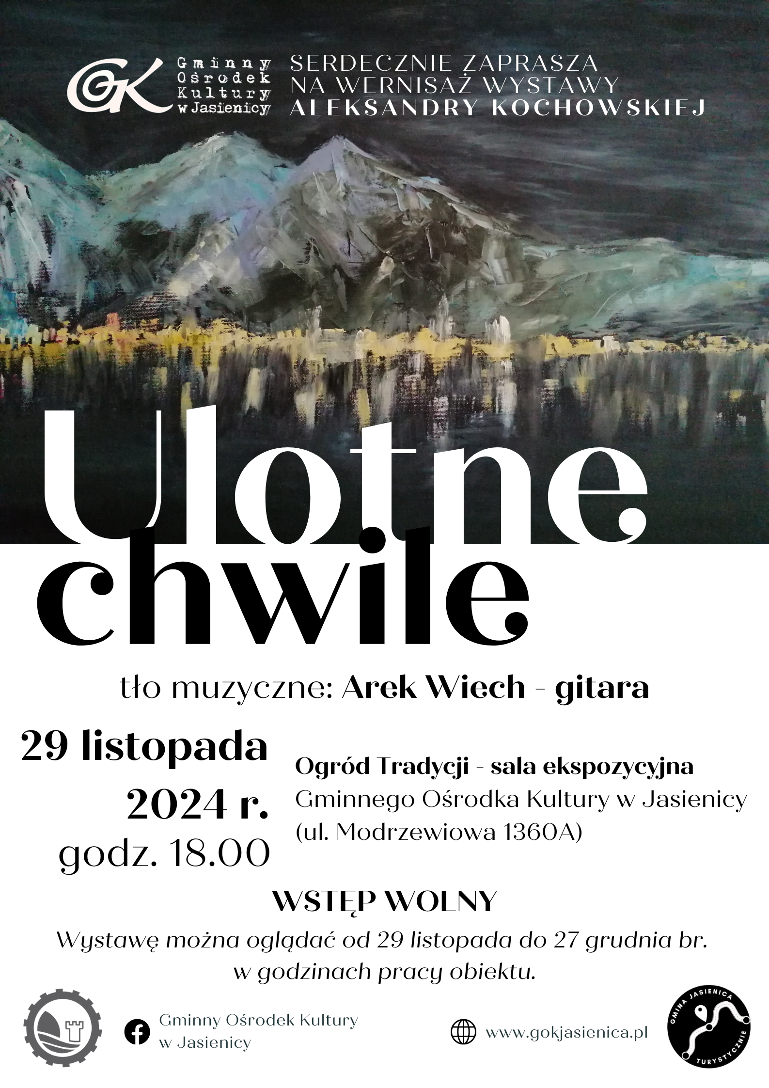 Gminny Ośrodek Kultury w Jasienicy zaprasza na wernisaż wystawy malarstwa Aleksandry Kochowskiej pt. „Ulotne chwile”.