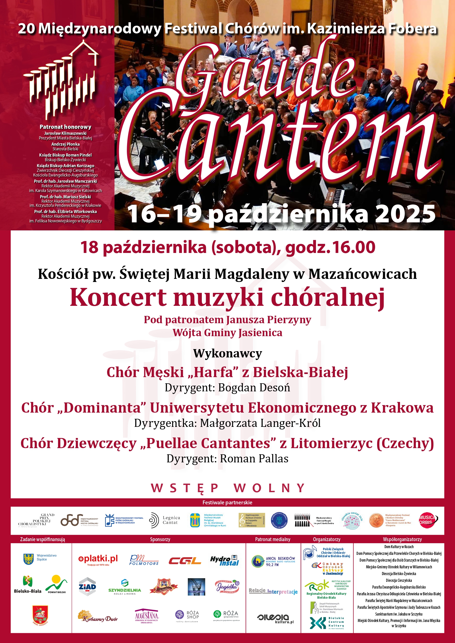 Koncert inauguracyjny Festiwalu (z udziałem Chóru Hejnał Mazańcowice oraz Zespołu Wokalnego VeraVoce z Mazańcowic, działających przy filli GOK w Mazańcowicach) odbędzie się 17 października (piątek) 2025 r. o godz. 19.00 w kościele pw. Jezusa Chrystusa Odkupiciela Człowieka w Bielsku-Białej (ul. Giewont 2). Wstęp wolny
