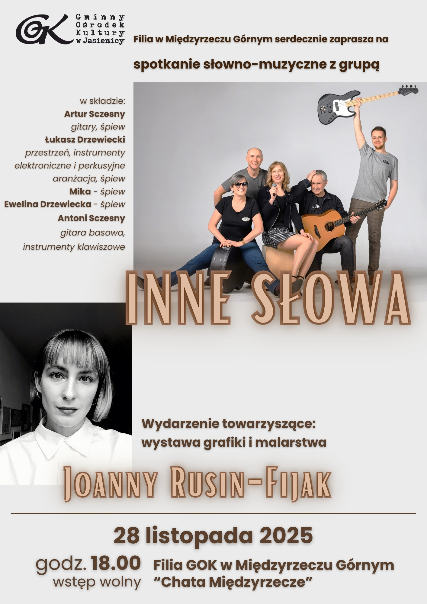 Filia GOK w Międzyrzeczu Górnym zaprasza na wydarzenie pt. Muzyka Słowo Obraz - spotkanie muzyczne z grupą Inne Słowa. W programie: