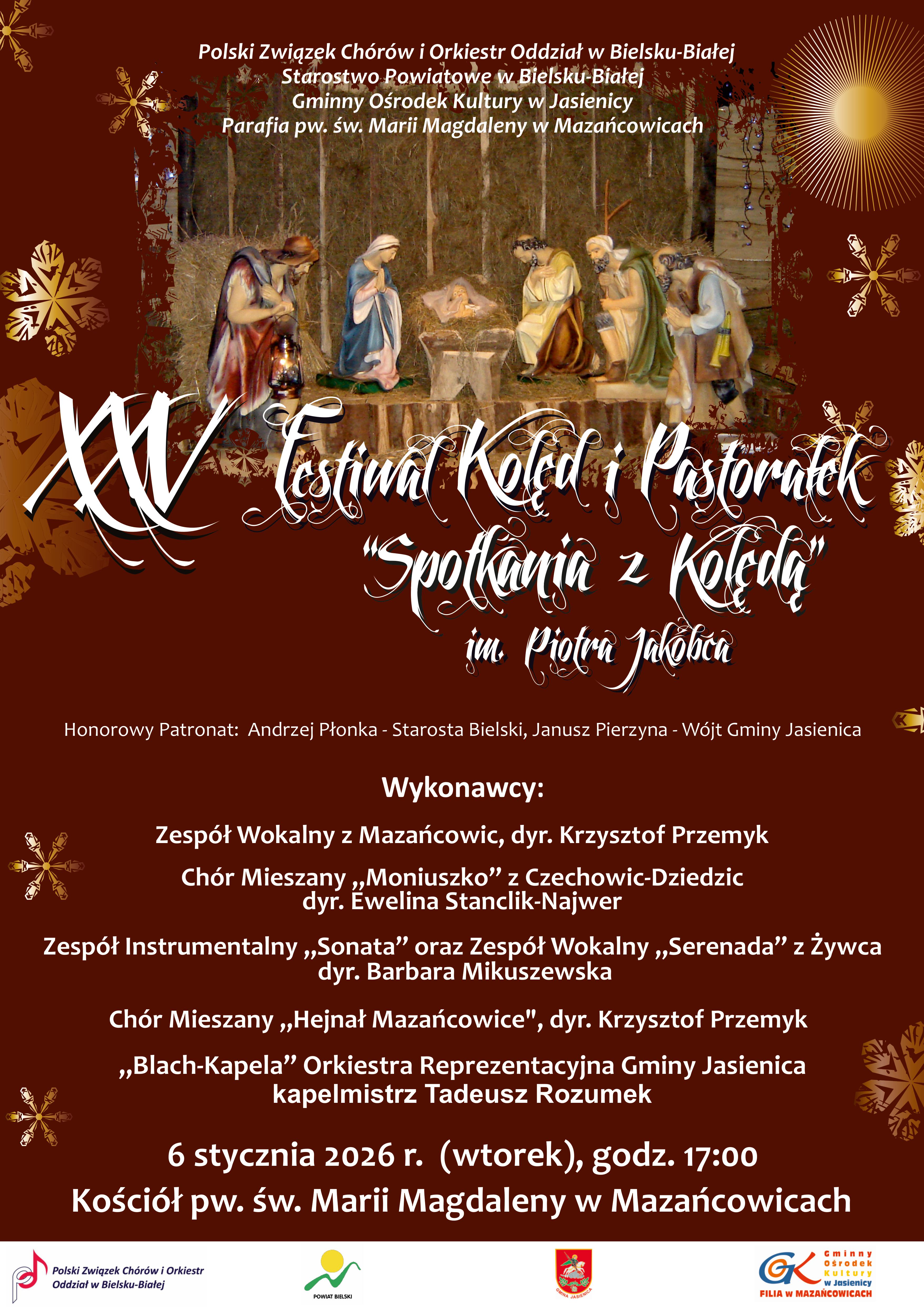Serdecznie zapraszamy na XXV Festiwal Kolęd i Pastorałek "Spotkania z Kolędą" im. Piotra Jakóbca, który odbędzie się 6 stycznia 2026 roku (wtorek) w kościele p.w. św. Marii Magdaleny w Mazańcowicach o godz. 17:00