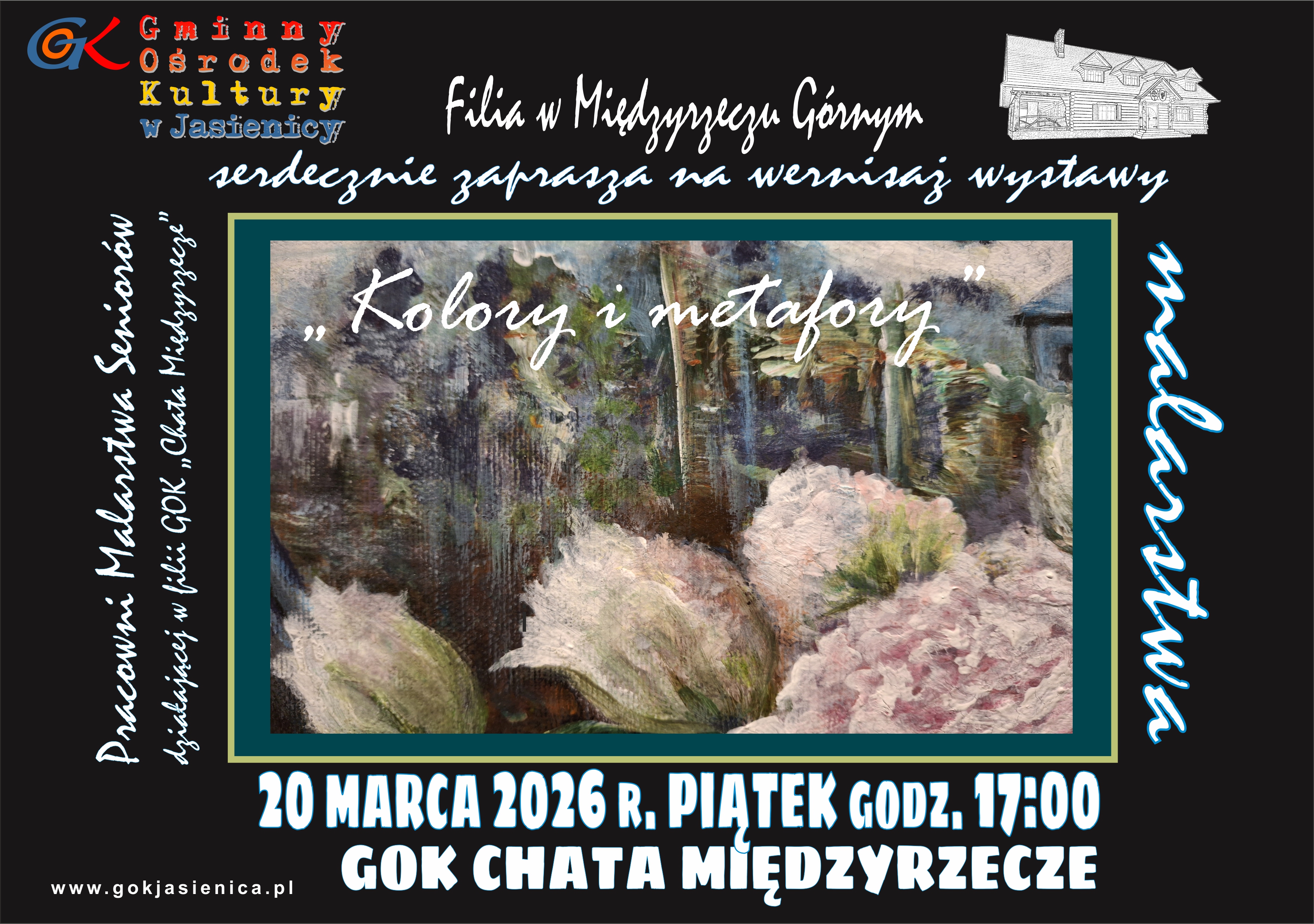 Filia GOK w Międzyrzeczu Górnym „Chata Międzyrzecze” zaprasza 20 marca 2026 r. (piątek) o godz. 17.00 na wernisaż wystawy malarstwa seniorów pt. „Kolory i metafory”.