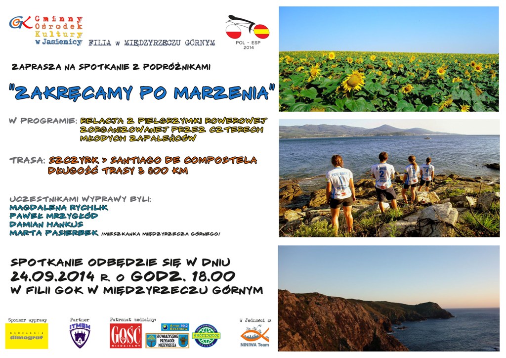 Gminny Ośrodek Kultury w Jasienicy filia w Międzyrzeczu Górnym zaprasza na spotkanie z podróżnikami pt. "Zakręcamy po marzenia". Spotkanie odbędzie się w dniu 24.09.2014 r. o godz. 18.00 w filii GOK w Międzyrzeczu Górnym "Chata Międzyrzecze".