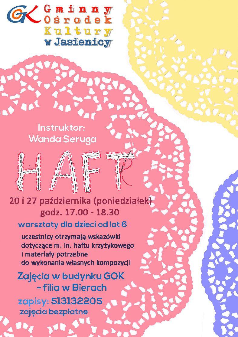 20 i 27 października zapraszamy dzieci (wiek od 6 lat) na warsztaty haftowania.