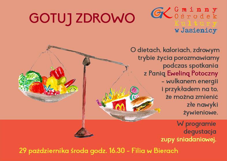 Zapraszamy na drugie spotkanie z cyklu „Gotuj zdrowo”. Tym razem porozmawiamy o tym, że można jeść słodkości i chudnąć. Pani Ewelina Potoczny opowie także o złych nawykach żywieniowych i sposobach na zdrowe odchudzanie. W programie także degustacja zupy śniadaniowej – idealnej przekąski na chłodne dni. Zapraszamy również Panów.