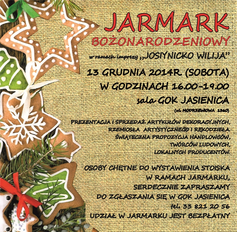 Zapraszamy na Jarmark Bożonarodzeniowy, który będzie trwał podczas spotkania "Josinicko Wilija". Impreza odbędzie się 13 grudnia w GOK Jasienica ( siedziba GOK przy boiskach "Drzewiarz", ul. Modrzewiowa 1360) w godz. od 16.00 do 19.00.