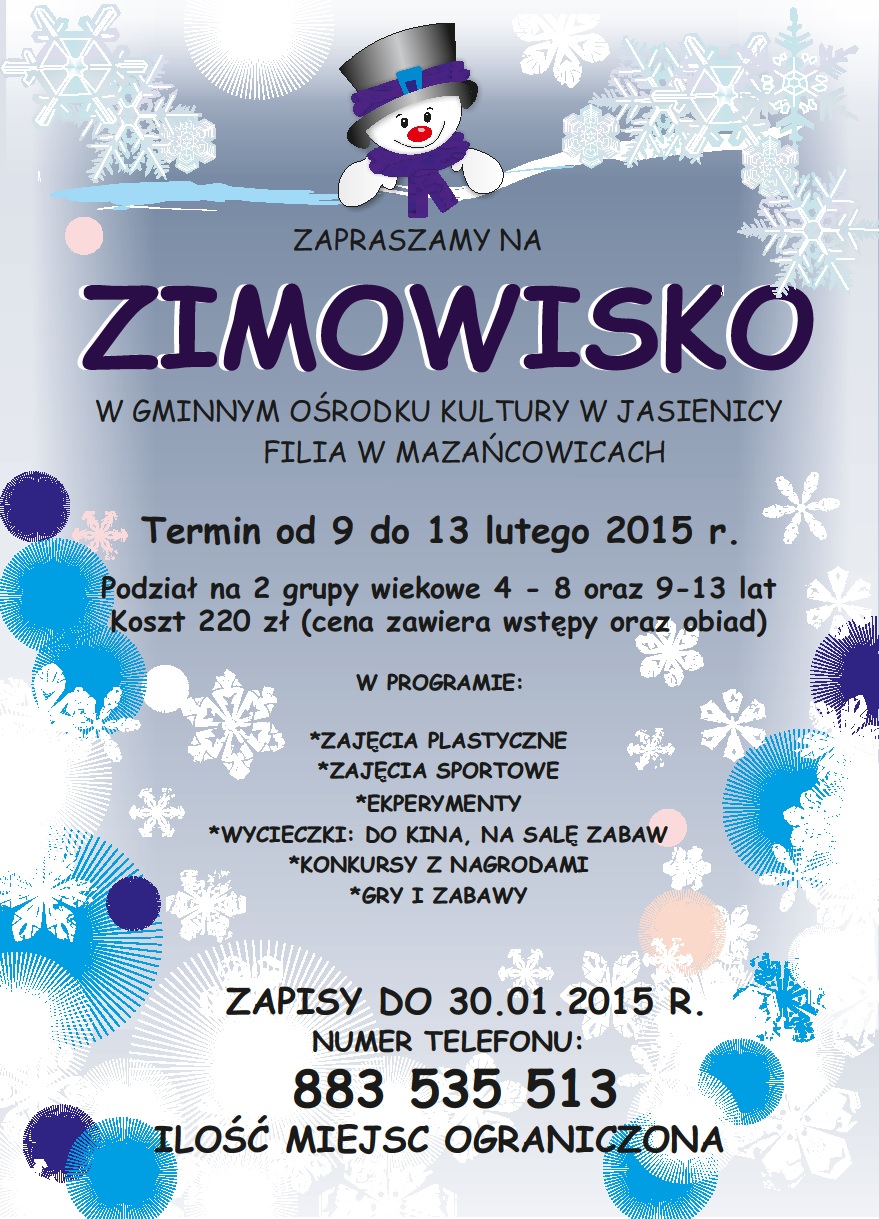 Gminny Ośrodek Kultury w Jasienicy filia w Mazańcowicach zaprasza na zimowisko.