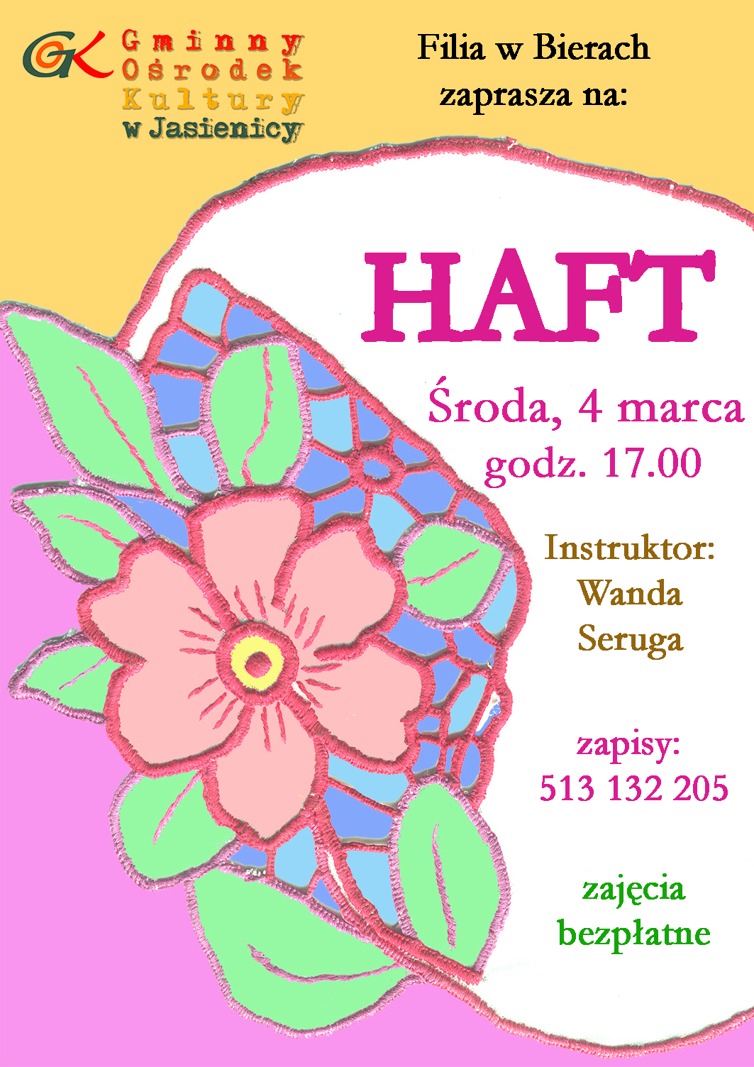 Zapraszamy na warsztaty haftu prowadzone przez panią Wandę Serugę. Zajęcia przeznaczone są zarówno dla tych, którzy chcą podszkolić swój warsztat a przy okazji dowiedzieć się wielu ciekawych rzeczy na temat swojej pasji jak i dla osób, które dopiero chcą rozpocząć swoją przygodę z haftem. Warsztaty odbędą się 4 marca (środa) o godz. 17.00 w filii GOK w Bierach. Zapisy pod numerem telefonu 513 132 205.